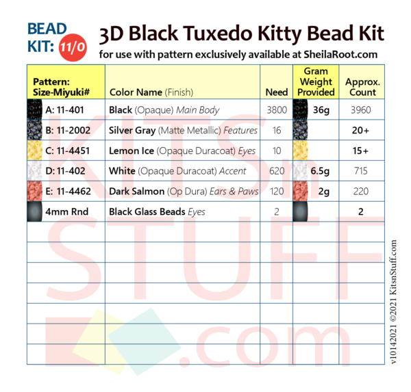 - Size 11/0 Miyuki Seed Beads for Black Tuxedo Kitty.